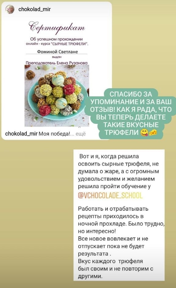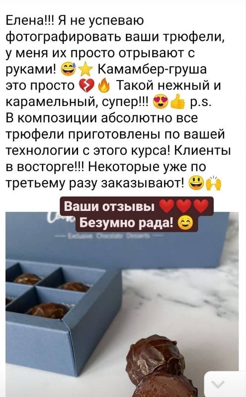 Вы уже работаете на заказ и хотите расширить свой ассортимент яркими рецептами. Новые вкусовые сочетания, интересные текстуры ждут вас на курсе. Уверяю многие конфеты станут вашими любимыми.